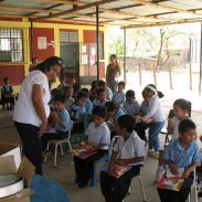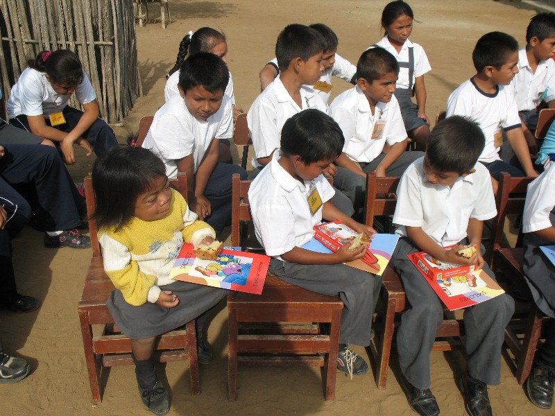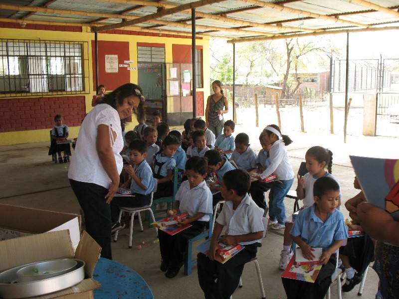 Our original goal was to visit the Santana village schools, but our mission grew to reach as many schools as we could both within Santana and in the entire surrounding area, to share the real meaning of Christmas. We knew we would need to come bearing gifts, and with the generous help of Activated Ministries, we received a donation of children’s books, bi-lingual card games, coloring books and color posters to share with each school group. Our itinerary grew as the word spread that two “foreign ladies” were doing presentations in local schools. We at first had to get permission to do a school program, but the news suddenly spread so that we had open invitations to every school, of all grades and ages in the entire area.
