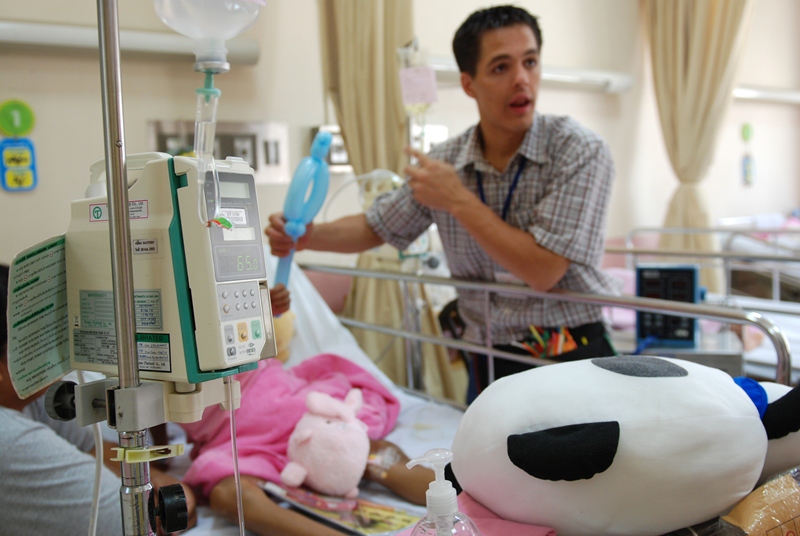 “Tamboon” is a practiced custom among the Thais of giving alms, often in appreciation of a received blessing, or part of celebrating one’s birthday. It was through a ‘tamboon’ that we came into contact with the children, nurses and staff of Siriraj Hospital. A good friend of ours wanted to offer a ‘tamboon’ towards the children of the hospital’s Cancer, Burn and Trauma wards and thought of our children’s entertainment programs that have become popular in our humanitarian efforts in Bangkok city and various upcountry provinces.Although in the past 15 years’ we have done many similar events in various other hospitals and institutions, there was a much more profound connection that we felt on our first introduction to Siriraj Hospital. The magic of the first 3 hours of entertaining the children with puppet shows, face painting, balloon sculpting, magic shows, games, gifts and laughter has continued beyond this ‘tamboon’ into our 3rd year this 2012!