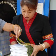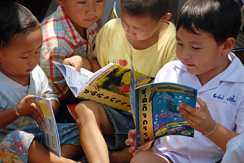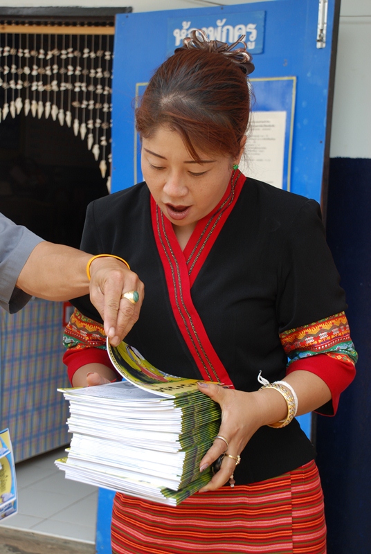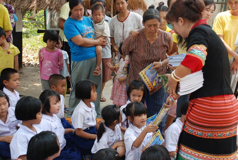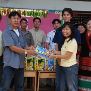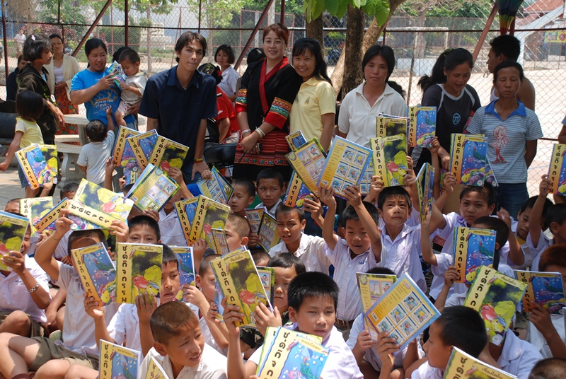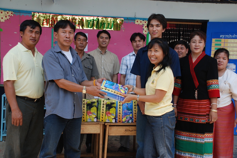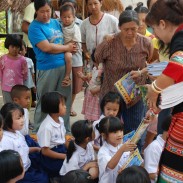 The arrival of the donated materials from Activated Ministries coincided perfectly with our most recent trip to Chiangmai. The Thai language Grandpa Jake storybooks and Grandpa Jake activity booklets were the perfect way to give each child a personal gift and give the teachers tools that they can easily use to teach good morals. We visited a very remote rural town called Wiang Hieng and we were able to work together with a very dedicated group of teachers and school administrators who attend to running two Thai schools, a Chinese language school, and a learning center at a refugee camp. They brought us to visit the children of the various schools and we distributed clothing, snacks, various donated books, the Treasure Attic VCD set, and the Grandpa Jake storybooks and activity books from Activated Ministries.