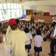 Khow yoi is south west of Bangkok, close to Thailand's border with Myanmar. Amongst the locals of this area are a lot of hill tribe residents. Two of the neediest local schools were blessed to receive sponsored books for the children. Between the two schools there are a total of around 200 children. These schools are not in the big city so therefore they don't have access to a lot of teaching materials. They also have a very limited budget for school supplies. The Grandpa Jake activity books made the children so excited as each child received his or her very own copy. We were also able to give the school a new selection of books for the library which will continue to be used regularly. Many of these children are the children of farmers and are therefore quite poor, so this opportunity which does not come so often has been a real encouragement to the teachers who also desire to give the best to their schools' children. The children surprised us by presenting a local Karen (hill tribe) dance to welcome our volunteer team. It was touching to see the effort and enthusiasm by all those involved.
