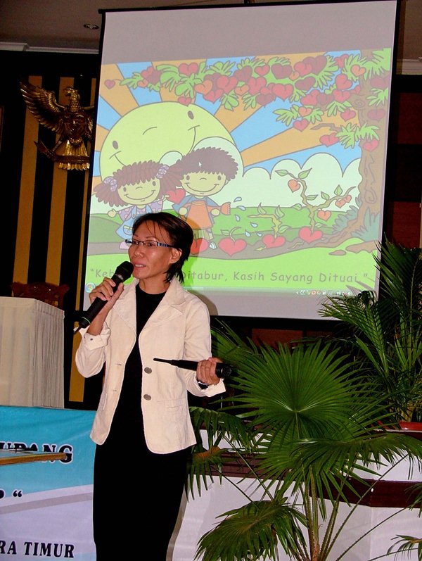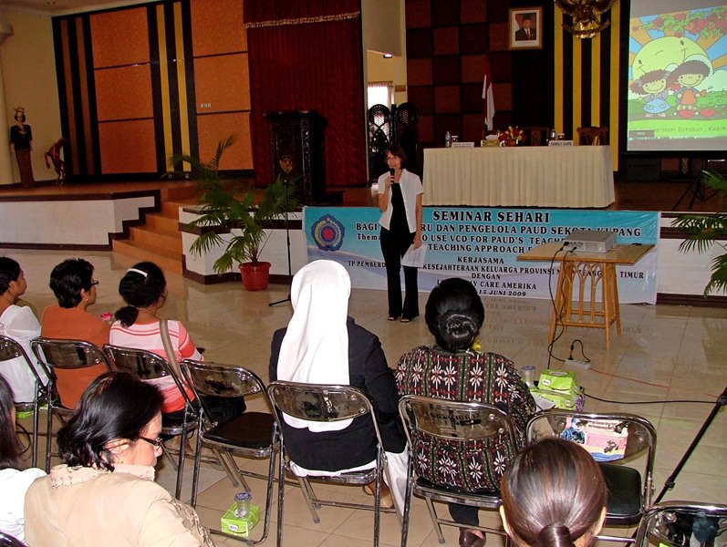 Family Care Indonesia (FCI) had been invited to Kupang, a city in the east of Indonesia, to conduct a seminar on how to use the Treasure Attic educational series in pre-schools. This was our first time conducting this sort of seminar so we spent a good deal of time preparing the material before leaving Jakarta. The seminar was to be held in the local language so all materials had to be translated. We translated five Treasure Attic activity books, a teacher’s guide on how to use the activity books as well as the seminar program itself – all of which were to be given for free to each of the 200 preschool representatives attending the seminar.