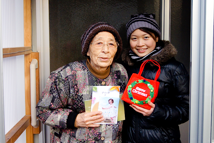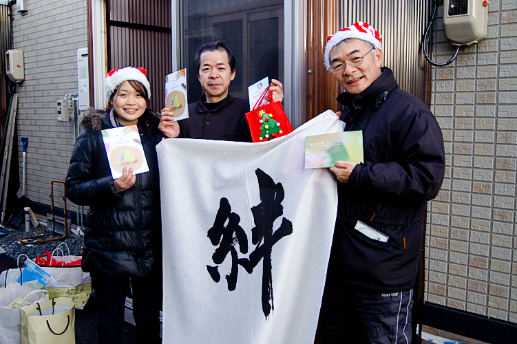 Sadly, most of the disaster areas have not been reconstructed since the time of the earthquake as if the place had been abandoned and the people there seemed at a loss. Two elderly ladies were standing outside their house talking about how no volunteers were coming out this Christmas. Then one of our members went up to them and said “Merry Christmas!” and offered a present and their happy expressions were unforgettable. “People’s hearts are heavier now than they were after the earthquake.” “Volunteers hardly ever come here.” Such words spurred us on despite the night’s minus-five degree weather.