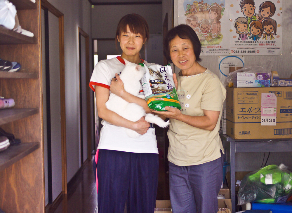 At the community center we found three families living together. They had all lost their homes to the tsunami. They seemed very happy about our sudden visit, especially the owner of the cat. Because the small area around the evacuation center had been left standing and could only be reached by a narrow road temporarily set up, they said going shopping was rather difficult and commented that if they only had two bicycles it would be much easier.