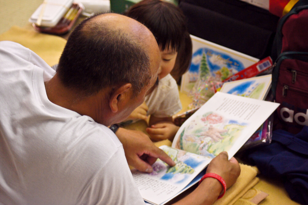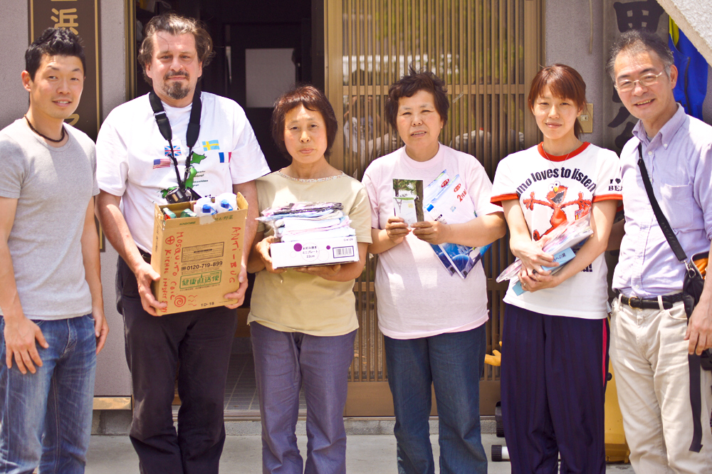 The team for our trip in June consisted of Isamu and Aaron, Chris (from France), and my children and me. We stayed at a friend’s house for one night, and although we already had two evacuation centers to visit in the afternoon, our hosts directed us to an evacuation center in Okumatsushima since we had some time in the morning. On our way there, we passed temporary roads with water stretching out on bothsides, saw capsized fishing boats in the mud, and an upended concrete building. The place must have been beautiful before the tsunami, but now was desolate. Thinking of all the work it will take to clear the debris and rebuild made my heart sink a little.