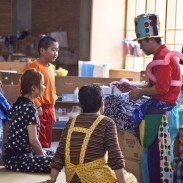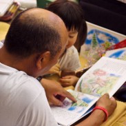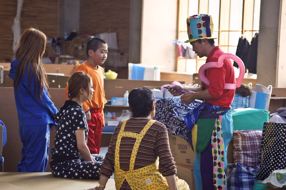 In the afternoon we visited the two evacuation centers, performed a clown show, delivered supplies, and gave the children picture books and toys. We were able to distribute encouraging booklets sponsored by Activated Ministries as well. At both centers, it impressed me that the people there were all very cheerful and smiling. One elderly man said chuckling, “At first it was difficult trying to sleep in one gym with all the people. Some people snore, others grind their teeth, and babies crying everywhere. But now I’m used to it.” A bed built of cardboard was made recently to alleviate the cold of the floor.