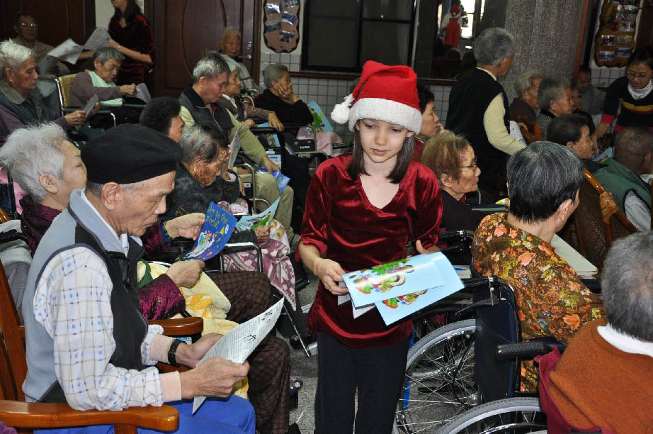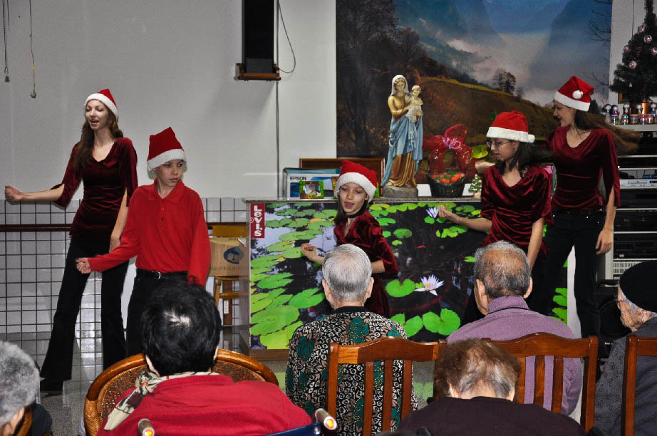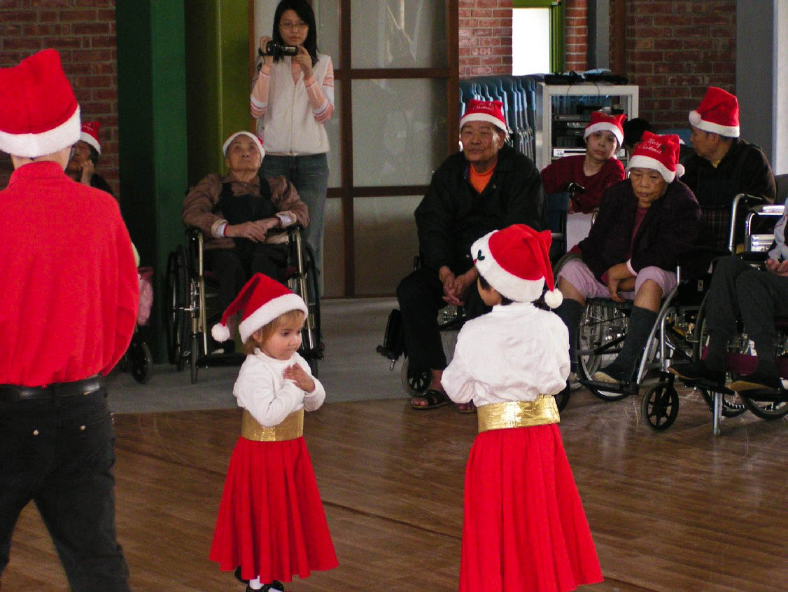 During Christmas 2009, Yilan Mission volunteers performed seventeen Christmas performances in Yilan County, Nanao and Hualien. These visits included hospitals, handicapped centers, elementary schools in aboriginal villages, an orphanage, nursing homes for the elderly and a university Christmas party.