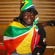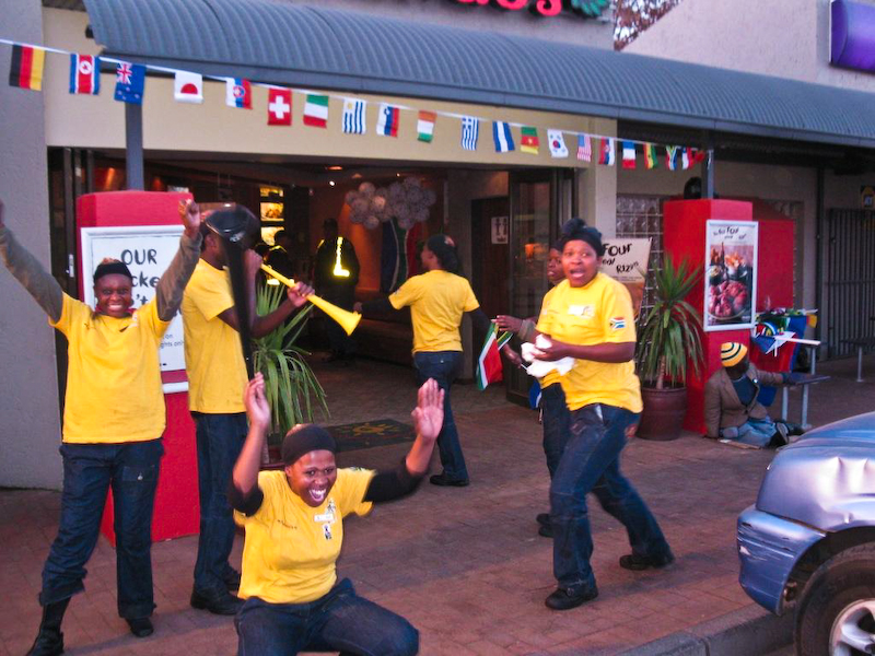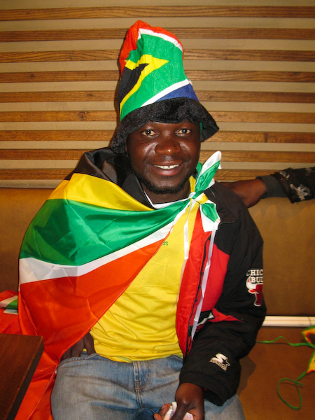 We stopped for a bite to eat an hour or two later, realizing we wouldn't make it to the stadium before the game and while we were there, South Africa scored the first goal of the World Cup! "Bafana, Bafana!" people were screaming, blowing their vuvuzelas (long horns that sound like elephants) non-stop and dancing around, absolutely wild with joy! Go South Africa!