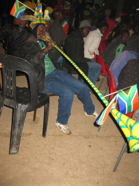 Today was the kick-off of the 2010 World Cup here in Johannesburg and we headed out the door with some of the Playing2Win volunteers around 10 am to take the trip to Soccer City, the stadium where South Africa would face Mexico. Normally this would have taken us an hour or so, but today was one very special day! By 3:30 we were still in the thick of traffic--cars with flags, cars honking their horns, cars with drivers wearing huge clown hats and glasses and people dancing in the streets and flags flying everywhere. It was chaotic, loud and very happy! South Africans everywhere were partying!
