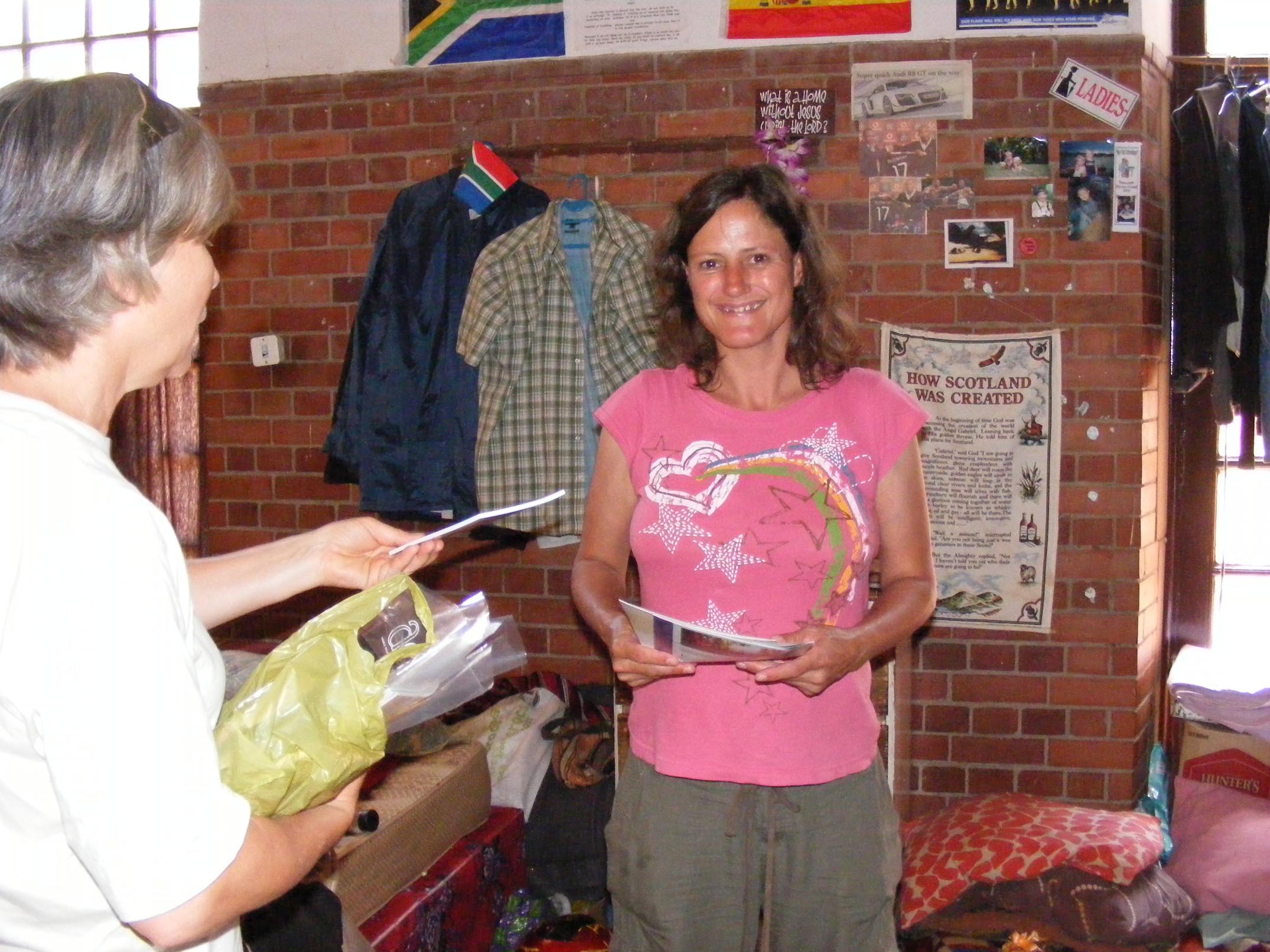 Our next stop was a visit to Sonheuwel (Sunny Hills) which is a camp ground resort—also on the outskirts of the city. The owner here has taken in poor white people who may bring caravans, tents or those who don’t own anything of this sort. From what we saw, it seems those who live there have to pay something each month, at least towards utilities as well, as it’s a case of when people do not contribute, they lack the respect and responsibility and often faucets and other items go missing from the bathrooms and so on. There is a care-taker on the property who oversees the place, and all food donations go through her to be shared between the 60 plus people living there. Clothing is also donated from a church and they have a little “free” store where one day a week people may look through items to get their needs.