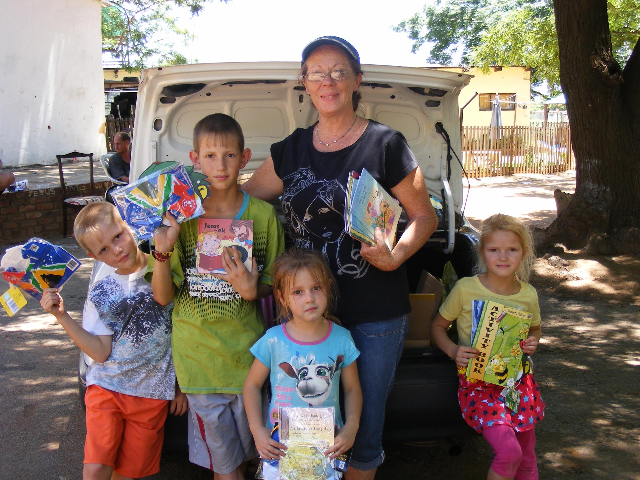 We were surprised to see how basic and poorly people there are living. At this particular place, our sole object was to meet with the children and give them books. We also wanted to assess the situation to see where else we could be a help in the future. Most of the children are Afrikaans speaking, and were absolutely thrilled to receive the books we had for them. Some titles have been translated into Afrikaans, and several were just hot off the press. They gladly took the English books too, as the school-going children learn English, and the older siblings enthusiastically said they would read these to their younger siblings, translating as they go along. We were very impressed by the children as although they were living in poor circumstances they were very polite and respectful. I spoke in Afrikaans to them as they led me around the camp searching out their friends, as they did not want anyone to miss out on such an opportunity. One of the boys, was so very attentive, and corrected my Afrikaans every now and then, and we would joke and laugh about the mistakes we both made trying to speak one another’s language.
