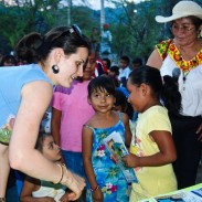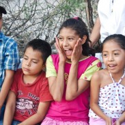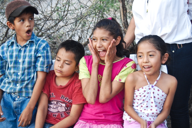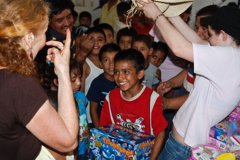 The day arrives. The sun is intense, dust is everywhere in the parched landscape, but you are used to having fun playing barefoot in the dirt. Suddenly, the high speakers of the village resonate with the good news that “they” have arrived, and you, along with a couple hundred other children start running as fast as you can to the center of the village, a huge unpaved square next to the colorful church. You are all running down from every hill and corner towards the funny-looking white and green truck which has just pulled up. Four very white looking people and a baby come out of the truck and busy themselves getting out boxes and bags of colorful presents from under tarps. You feel so excited! A few of the community mothers are there with you, displaying their habitual resigned calmness. A couple of dads are also present, looking dignified with their shiny white cowboy hats. And the activity begins!
